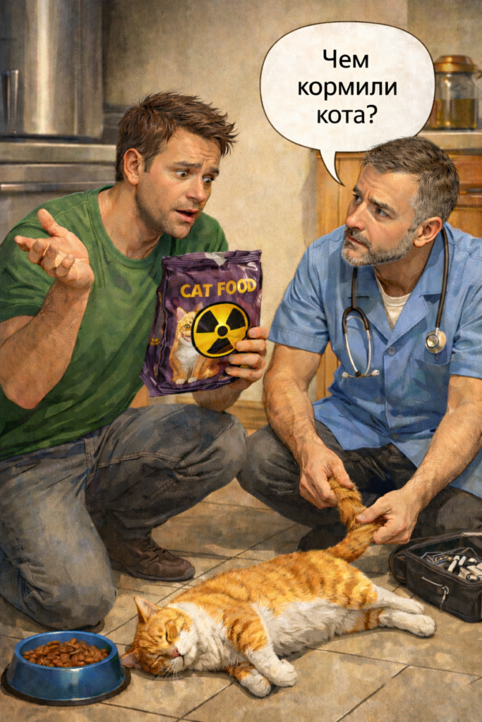 После длинного отвлекательного разговора врач настаивает на своем мнении и снова задает тот же вопрос, что выглядит уже невежливым: «Чем кормили кота?»