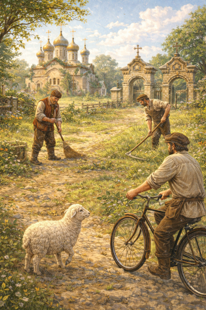 А один раз, летом, бедняк проезжает на велосипеде и видит картину: храм заброшен, богач подметает возле него, а его друг косит траву на территории церкви. Одежда на них попроще. И снова бедняк подумал: «Чему я могу научиться?»