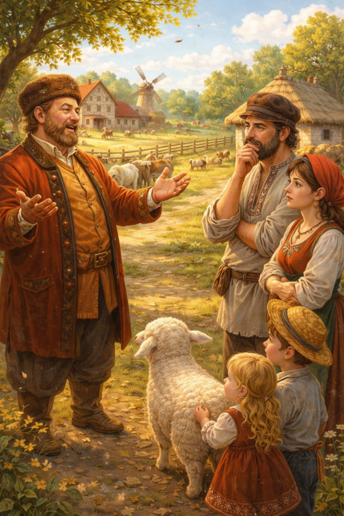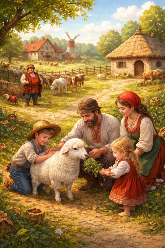 Был один кум-городок, на подобие, как гоголевская провинция. А там два человека жило: один — богатый, а другой — бедный. У богатого была большая ферма и поля для коров и овец. А у бедняка только одна овечка была, которую он купил. В их семье эта овечка была как ребёнок. Они с его детишками вместе с ней играли, кормили её и всем было весело.