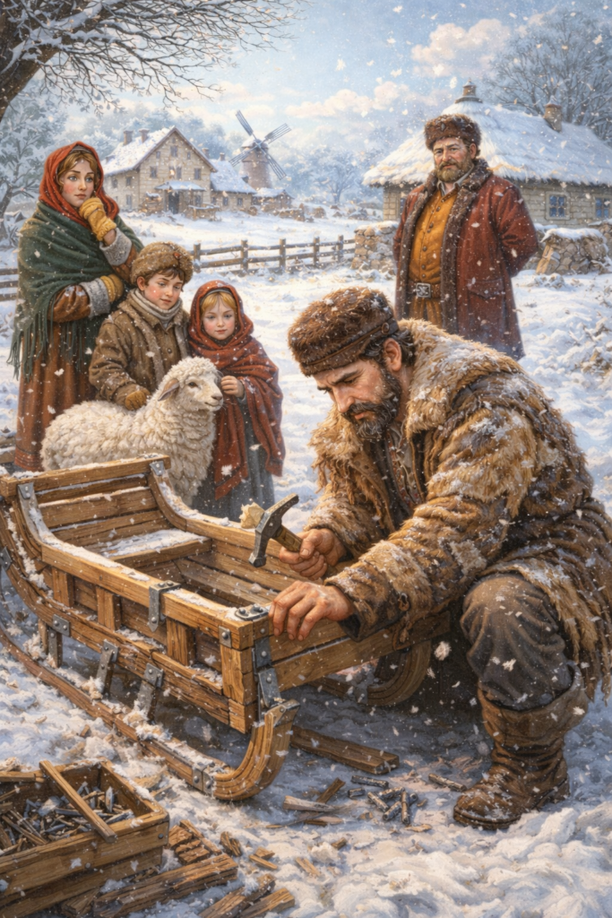 В течение речи богач, обращаясь к супруге бедняка, упомянул, что она «не в те сани села» и тогда бедняк сразу поставил цели на зиму — укрепить сани.