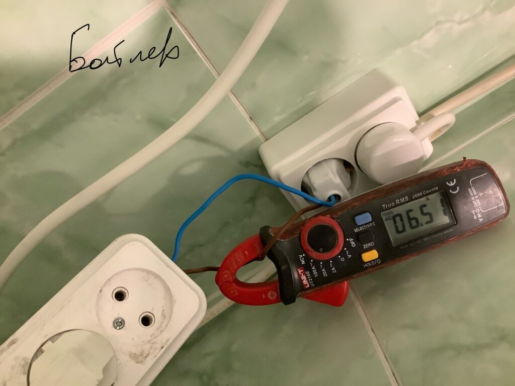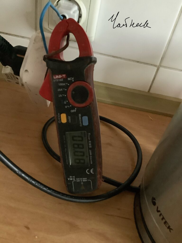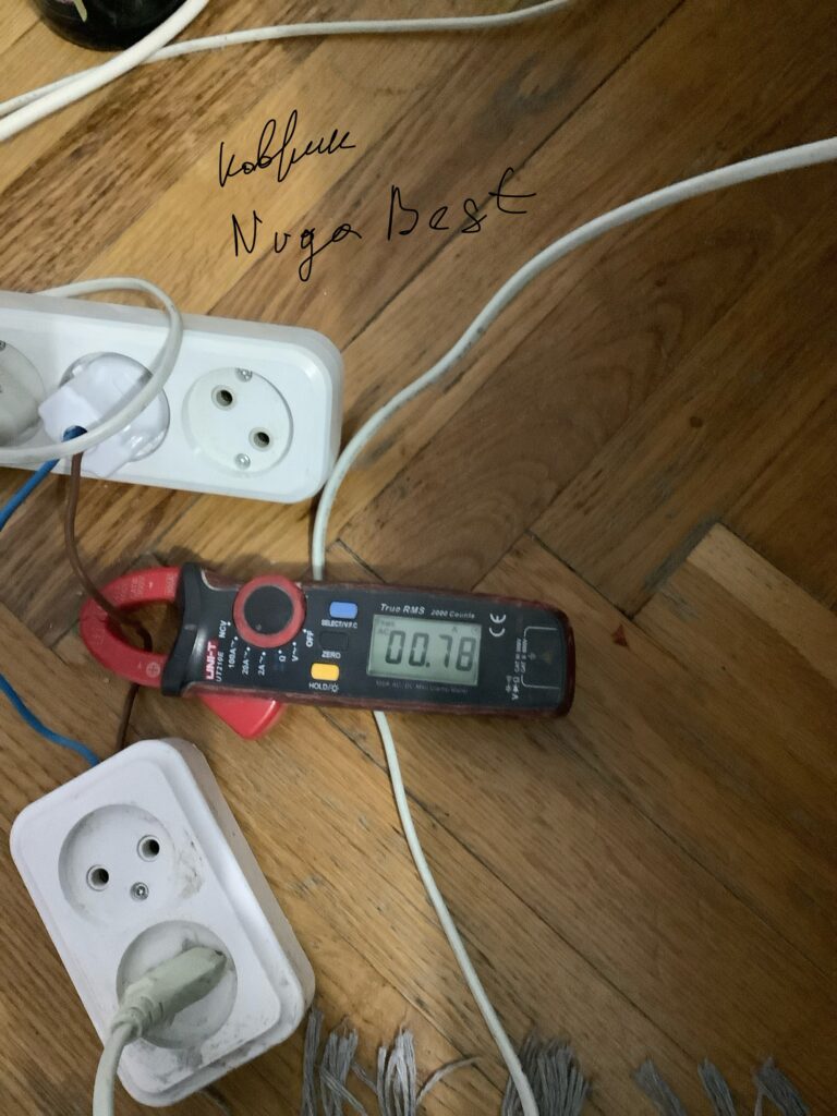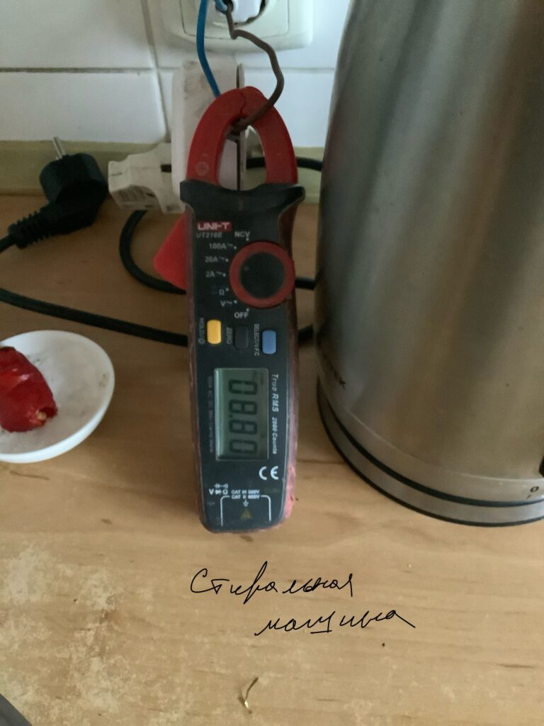 Чтобы измерять токи потребления клещами, надо немного подготовиться. Например, купить такие клещи, а также сделать такую штуку, на подобие удлинителя, только там две жилы провода доступны для обхвата токовыми клещами. Если просто провод весь измерять — ничего не покажет, потому что ток переменный и ноль с фазой взаимно компенсируют магнитное поле.